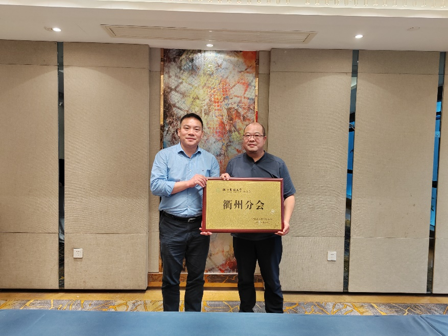 会后,哀建国代表公司为衢州各地员工分会授牌,并邀请大家来校参加65周年校庆活动。