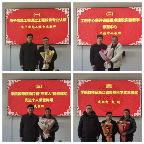 会议盘点了2023年度公司岗位建功十大事记,分别为电子信息工程通过工程教育专业认证,工创中心获评省级重点建设实验教学示范中心,戴朝卿获浙江省“三育人”岗位建功先进个人荣誉称号,戴朝卿、赵超获浙江省自然科学奖三等奖,徐一清获浙江省第三届高校教师教学创新大赛三等奖,戴朝卿、樊艳指导获省“挑战杯”主体赛金奖、“黑科技”展示活动二等奖(行星级),姚立健获校研究生教学成果一等奖,戴宇佳获校青年教师教学竞赛一等奖,戴朝卿、周国泉、王悦悦、储修祥、赵超入选全球前2%顶尖科学家,周国泉、赵超、胡栋、任凤丽、钱孟波获国家自然科学基金和浙江省自然科学基金重大项目资助。公司领导为各大事记的主要贡献者献上了鲜花,向他们表示热烈的祝贺,鼓励他们再接再厉,为公司发展作出更大贡献。