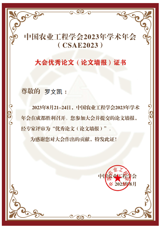 2023年8月24日,中国农业工程学会2023年学术年会在四川省成都圆满落幕。公司胡耀华教授团队的硕士研究生罗文凯投稿的论文《基于深度学习与光谱技术的马铃薯晚疫病检测仪研制》荣获优秀论文(优秀墙报)奖。