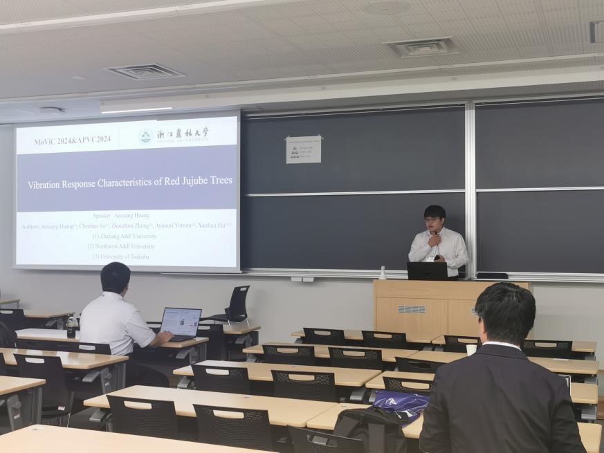 在MoViC 2024和APVC2024联合大会上,胡耀华教授团队的2023级硕士研究生黄安祥参与了会议,并作了题为“Vibration Response Characteristics of Red Jujube Trees”的报告。黄安祥在报告中使用有限元方法分析了红枣树的振动特性,重点研究了固有频率、振动模式和模态形状。这一研究为设计小型红枣振动采收设备提供了关键的技术支持。