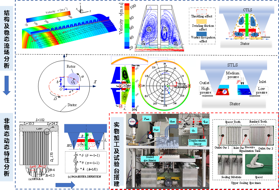 该论文通过在梯形密封齿腔内增加扰流隔板,构造一种隔板齿腔迷宫密封结构,可在不改变密封原有的轮廓尺寸条件下分割齿腔,精细控制齿腔内的流体流场,提高密封的稳动态特性。论文通过瞬态动网格数值模拟与椭圆涡动模型及平板间隙密封泄漏特性实验平台等,对比分析了几种典型隔板迷宫密封泄漏控制能力及动态稳定性。结果表明,增加隔板后齿腔内形成的复杂紊乱漩涡对间隙射流的阻碍作用,和漩涡与齿顶间隙处流动惯性效应叠加导致的出口“节流收缩效应”增强,会使得隔板的迷宫密封结构其控漏能力明显改善,其中十字齿及侧齿隔板迷宫密封的最大泄漏率降幅分别为25%、22%左右。十字齿及斜齿隔板迷宫密封的有效阻尼可分别提升36.6%、21.3%,有效刚度系数提升56.1%、43.4%。该创新型结构的提出及对于流场深入细致的研究,对于工业上提高迷宫密封性能具有一定意义。