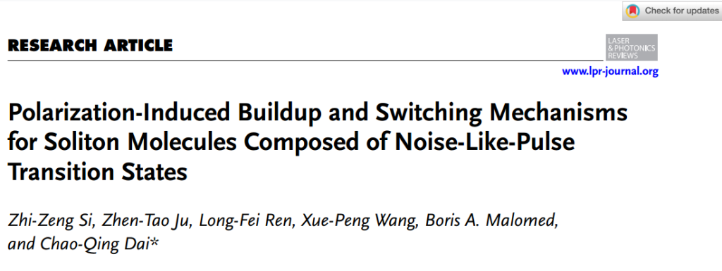 近日,必一运动戴朝卿教授领衔的先进光电子应用基础交叉研究中心科研团队在光学领域国际权威期刊《Laser & Photonics Reviews》(中科院1区TOP,五年影响因子:11.1)上发表了题为《极化诱导的涉及类噪声过渡态的孤子分子累积与切换机制》(Polarization-Induced Buildup and Switching Mechanismsfor Soliton Molecules Composed of Noise-Like-PulseTransition States)的研究论文。这是该研究团队近两个月内第二次在该期刊发表高水平文章,首次在高强度光场中揭示了孤子抵抗强非线性效应而发生的新型建立与切换机制,这不仅在理论上丰富了非线性光学和孤子动力学的研究内容,还在实际应用中展示了其潜在的巨大价值,为光学信息处理技术的发展开辟了新的方向。
