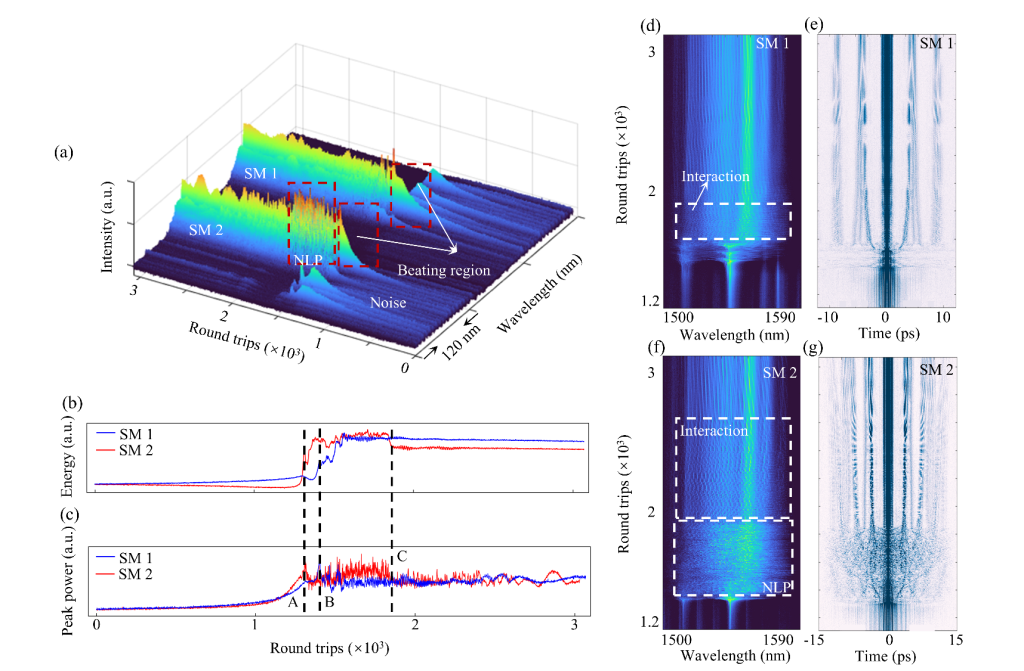 在现代光学和非线性光学领域,非线性孤子动力学的研究具有重要的理论和应用价值。特别是在高强度光场下,光学系统中的噪声和强非线性效应导致孤子行为的不可预测性,探索一种能够在强非线性环境中稳定存在的孤子构建和切换机制,对于提升光学系统的性能具有重要意义。戴朝卿教授团队针对强光场环境下的孤子稳定性,设计了一种新型的强非线性光学系统,包括饱和吸收体金属有机框架(MOF-253@Au)和极化控制器,揭示了孤子分子在复杂非线性系统中的动态行为。研究发现,强非线性下孤子分子为抵抗光学腔中的“湍流”,在建立阶段会形成一种长时间的类噪声脉冲过渡态。通过极化诱导,多脉冲态下由交叉相位调制效应主导的孤子分子与类噪声脉冲之间的切换机制也被剖析,主要涉及谱崩溃与振荡以及噪声态到自组织过程。理论上综合分析了极化角度对孤子态周期性相变的影响,并准确再现了实验中观察到的构建和切换机制。