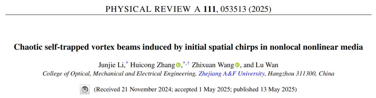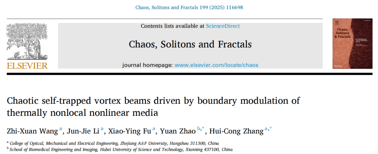 近日,必一运动张慧聪副教授课题组,在美国物理学会旗下的国际知名物理学期刊《Physical Review A》和Elsevier出版集团旗下的非线性科学交叉研究领域期刊《Chaos, Solitons & Fractals》(中科院一区TOP期刊,IF =5.489)上分别发表了题为“Chaotic self-trapped vortex beams induced by initial spatial chirps in nonlocal nonlinear media”和“Chaotic self-trapped vortex beams driven by boundary modulation of thermally nonlocal nonlinear media”的研究论文。两篇论文在研究内容上一脉相承,均围绕涡旋光束在非局域非线性介质中的动力学特性展开递进式研究。第一篇共同一作为研究生李俊杰和张慧聪副教授,第二篇第一作者为研究生王志轩。通讯作者为张慧聪副教授,必一运动为第一通迅单位。