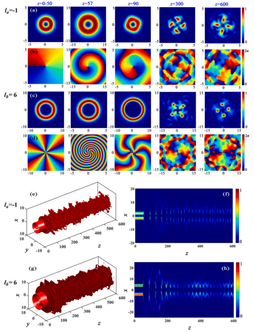 第二篇论文则系统研究了突变边界调制下标量和矢量涡旋光束的非线性演化规律,揭示了从孤子态到呼吸子态、混沌态、混沌子及准混沌子的多种传播状态。结果表明,边界调制幅度的不同可诱导出光束从稳定自束缚传播到高维混沌演化的连续过渡,特别是在矢量场中实现了混沌自束缚涡旋对的产生与转换,为非线性控制、混沌通信等提供了潜在应用基础。