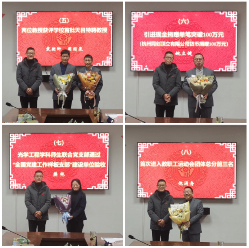 会议盘点了2022年度必一运动十大事记,分别为电子信息工程专业认证通过进校考查,2022届学硕研究生读博率达58.8%,公司省部级科研平台取得零的突破,公司科研总经费突破1000万元,戴朝卿、周国泉获评公司首批天目特聘教授,公司引进现金捐赠单笔突破100万元,光学工程学科师生联合党支部通过“全国党建工作样板支部”建设单位验收,公司首次进入教职工运动会团体总分前三名,倪忠进荣获“浙江省高校最受师生喜爱的书记”荣誉称号,徐小平荣获浙江省本科院校首批“优秀教务人员”荣誉称号。