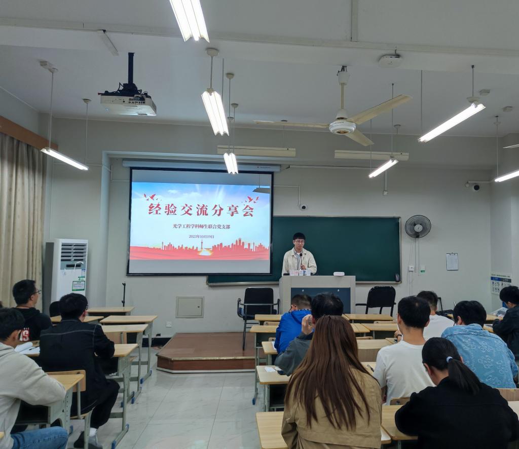 10月19日下午,光学工程学科师生联合党支部在学14-419成功举办了以“经验交流分享,携手创新发展”的主题党日活动,邀请光机电公司研212班曹祺豪和但汶松两位同学介绍研究生期间的科研学习心得体会和经验建议。活动由支部组织委员时宝龙和宣传委员杨景楠主持,全体党员踊跃参加。