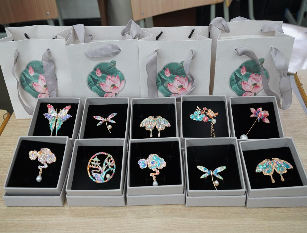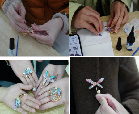 本次活动特别邀请到了艺术公司孙磊老师作为活动指导,活动开始前,孙磊向大家详细介绍了螺钿工艺的历史渊源,仔细讲解螺钿胸针的制作过程,同时展示了系列精美的螺钿作品。公司女教师和女员工代表们在掌握了制作过程后,纷纷投入制作,经过一个多小时的精细作业,一枚枚独一无二的螺钿胸针终于完成。