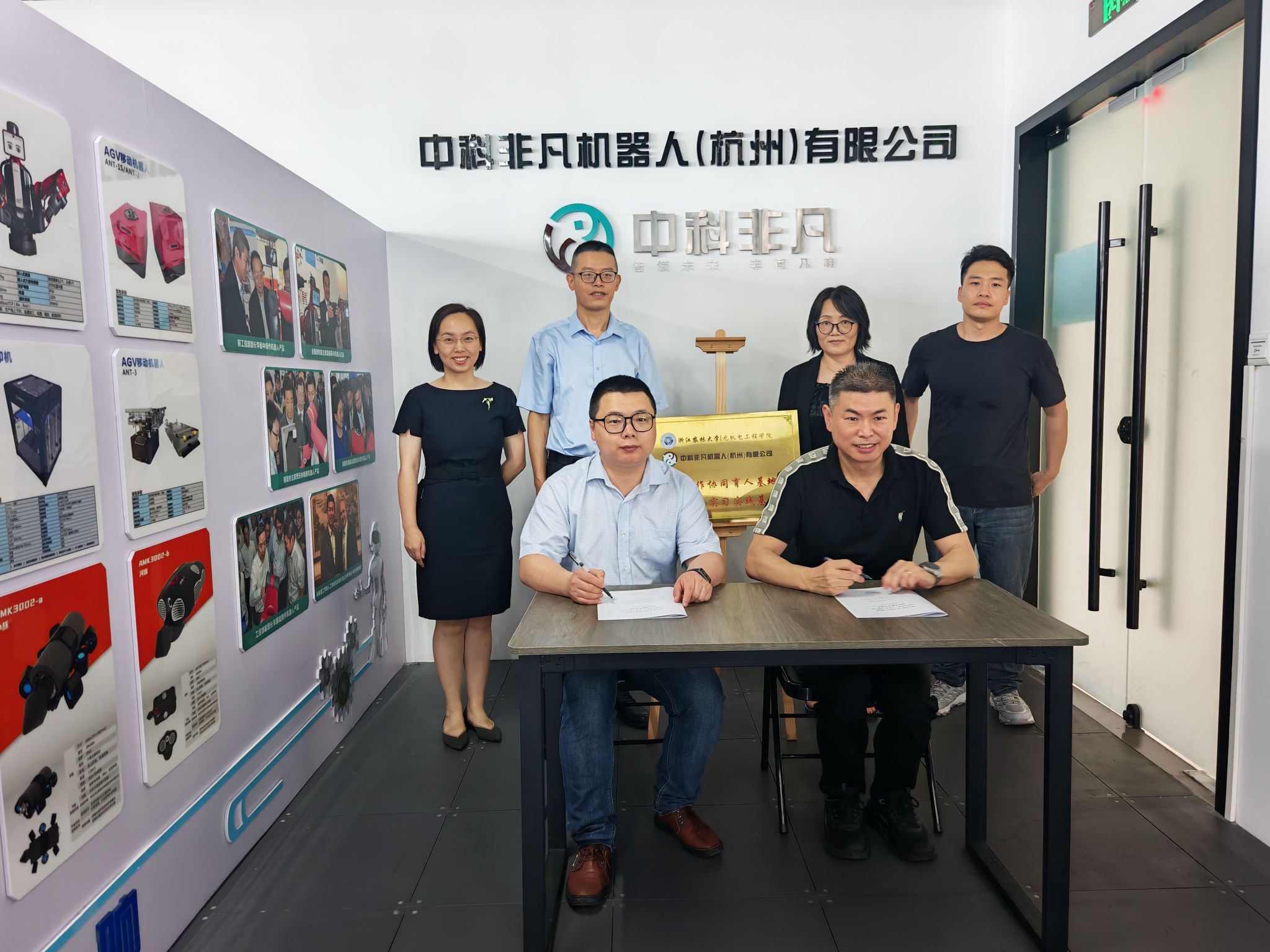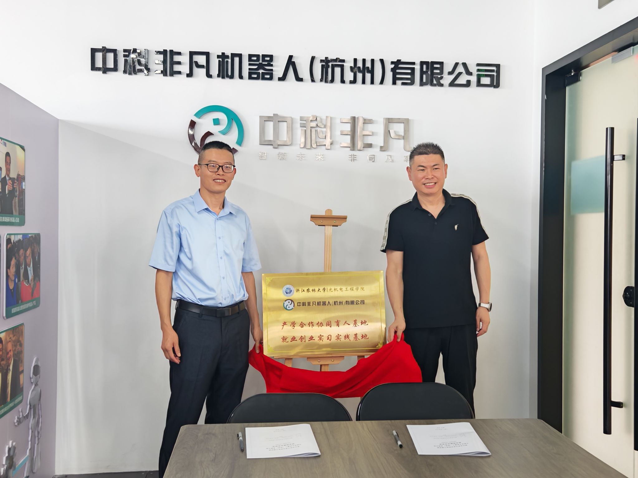 为深化产教融合,拓宽毕业生就业渠道,精准对接企业用人需求,2025 年 6 月 14 日上午,公司党委书记何利平率队赴中科非凡机器人(杭州)有限公司开展访企拓岗专项行动,并举行校企合作实习基地签约揭牌仪式。公司副经理周竹、党委副书记应莺、智能装备与系统专业负责人马蓉及专业助理韩润哲一同参加此次活动。