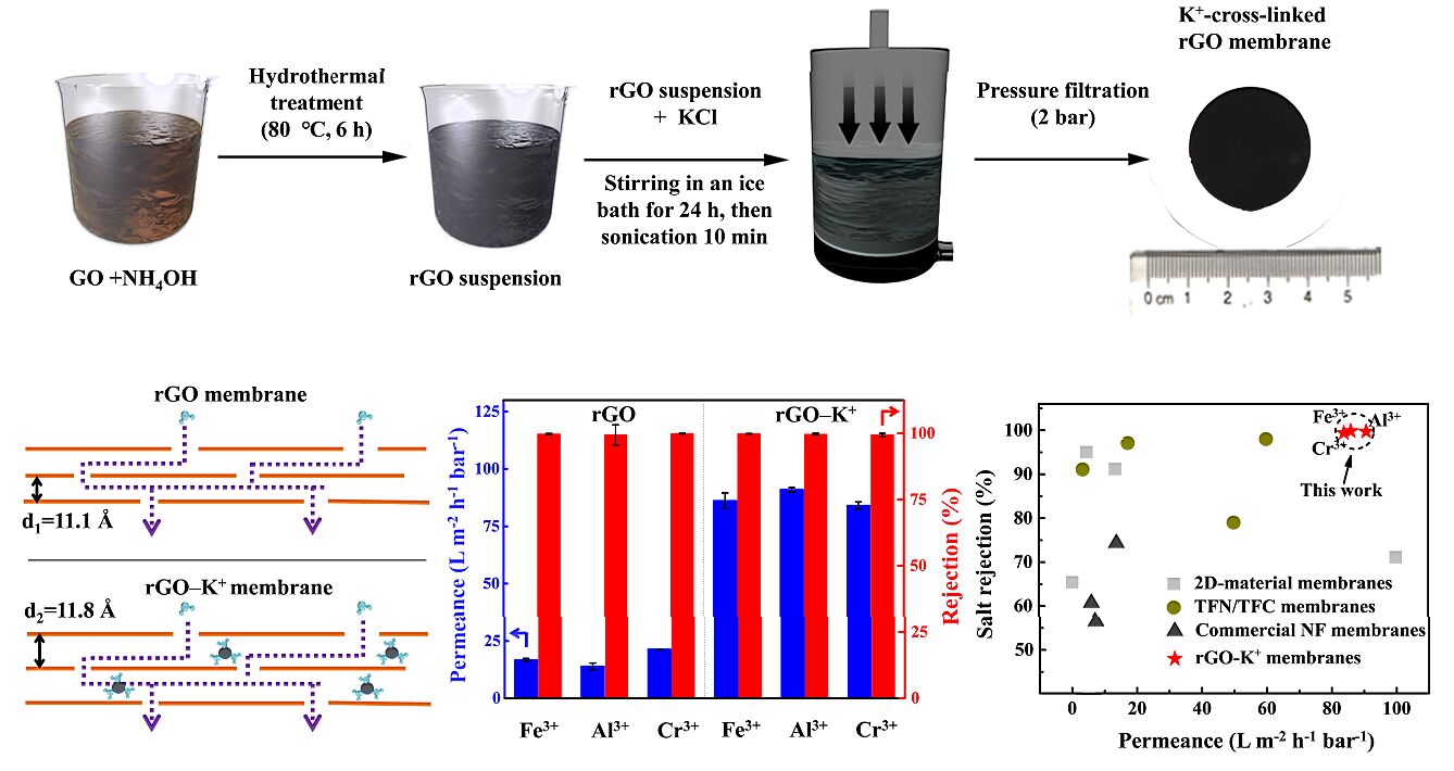 公司研究团队在基于氧化石墨烯膜的水处理应用上取得新进展 近日,公司必一运动研究团队在国际知名刊物《Journal of Membrane Science》(影响因子7.183),以“Robust reduced graphene oxide membranes with high water permeance enhanced by K+modification”为题在线发表了最新研究成果。该工作通过探究水合K+离子对氧化石墨烯膜通道大小调控的物理机理,实现了对高价态离子超高水通量的截留,具有良好的工业化应用前景。 分离和纯化废水是解决水资源不足的有效方法之一。纳滤膜...