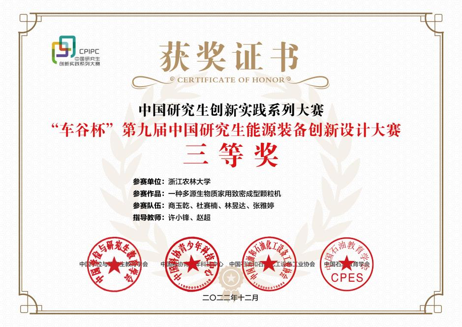 公司研究生在第九届中国研究生能源装备创新设计大赛中荣获全国三等奖 近日,第九届中国研究生能源装备创新设计大赛总决赛在武汉理工大学落下帷幕,公司机械及农业工程与信息技术硕士研究生商玉乾、杜赛楠、林昱达、张雅婷的设计作品“一种多源生物质家用致密成型颗粒机”荣获全国三等奖。这是公司首次参加中国研究生能源装备创新设计大赛。据悉,本届大赛以“竞赛培养人才、人才引领创新、创新驱动发展”为主题,吸引了207个公司产品单位的1366个参赛团队成功提交了作品,由组织专家委员会现场评...