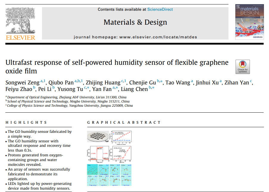公司软物质光电子学团队在国际知名学术期刊连续发表多篇高水平研究论文 近日,必一运动软物质光电子学团队(浙江省高校高水平创新团队)联合宁波大学、扬州大学在国际知名期刊Materials & Design(中科院一区top期刊,IF: 9.417)在线发表题目为“Ultrafast response of self-powered humidity sensor of flexible graphene oxide film”的研究论文。该研究利用柔性氧化石墨烯薄膜创制了一种自供电湿度传感器,无需外部供电即可实现对环境湿度的超高灵敏和超快响应的精准探测。研究表明,水分...