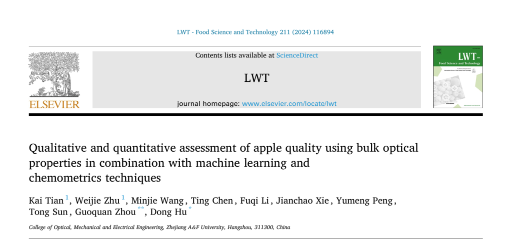 机械与电子本科生在国际学术期刊发表高水平研究论文 近日,公司机械专业213班本科生田恺、电子专业211班本科生竺炜杰在国际学术期刊《LWT-FOOD SCIENCE AND TECHNOLOGY》(中科院一区TOP,IF5=6)在线发表题为《Qualitative and quantitative assessment of apple quality using bulk optical properties in combination with machine learning and chemometrics techniques》的研究论文。田恺、竺炜杰为共同第一作者,周国泉教授、胡栋副教授为通讯作者。苹果组织光学特性参数是...