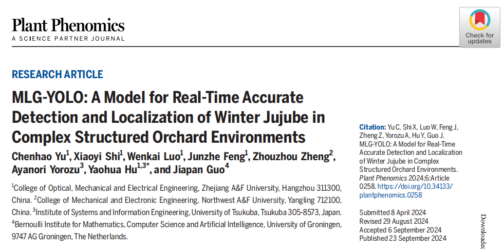 胡耀华教授导学团队俞晨浩同学发表三篇高水平论文 胡耀华教授导学团队在冬枣采收领域取得了重要进展。团队的研究成果发表在植物表型领域的国际权威期刊《Plant Phenomics》(中科院1区期刊,ESI期刊,五年影响因子:7.7),论文题为《MLG-YOLO: A Model for Real-Time Accurate Detection and Localization of Winter Jujube in Complex Structured Orchard Environments》。这是B-Sports首次以第一及通讯单位在该期刊发表的研究成果,是胡耀华教授团队在枣果采收研究中的又...
