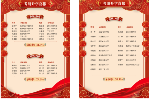 公司2023年考研升学喜报 公司2023届本科毕业生锐意进取、刻苦努力,在受新冠疫情持续影响和考研压力倍增的情况下,依然克服重重困难坚持到最后,最终取得了优异的成绩。2023届本科毕业生共计77人被成功录取,考研升学率达到35%,升学率再创新高!其中机械191班升学率为41.4%、机械192班升学率为29.6%、机械193班升学率为53.1%、机械194班升学率为38.7%、机械195班升学率为33.3%、电子191班升学率为30.5%、电子192班升学率为23.3%,特向全院师生报喜!(...